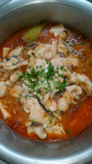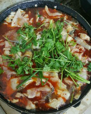锅中放入400g菜油煎好后就放郫县豆瓣和油泼辣子再加入切好的葱丝姜丝和切好的辣椒段及洋葱,煎好后锅中加入1000g水待水烧开后加入事先用盐腌好的鱼(鱼用盐腌20钟也可以加点料酒去腥味,待要下锅煮的时候再在加淀粉和好)煮5分钟就可以出过了