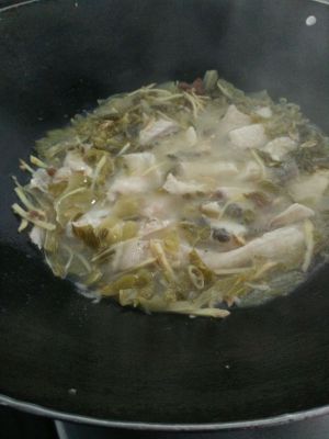 放鸡汤,加盐、糖调味。大火烧开后,下鱼片,轻轻滑开至鱼片煮熟,撒葱花。