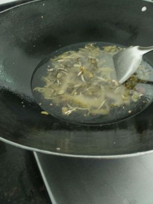 锅里放油,爆香姜蒜片、花椒,放干红辣椒、酸菜、泡椒一起翻炒出酸味。
