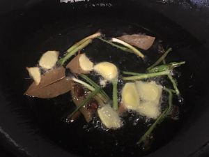 把葱姜蒜香叶等香料煸香后滤干净
