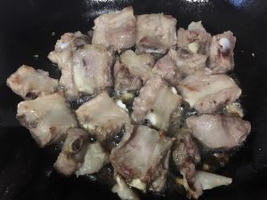 锅内放入油,待油热后放入冰糖至冰糖融化!之后倒入排骨,炒至微上色,放入酱油,醋,料酒,少许盐,再倒入那半碗排骨汤!