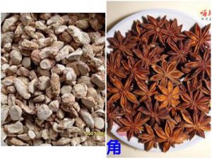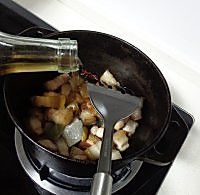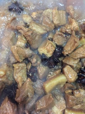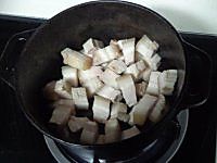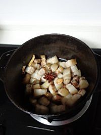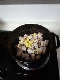 1.猪肉解冻切成块状,三萘八角桂皮用植物油翻炒