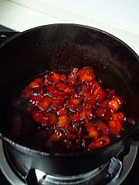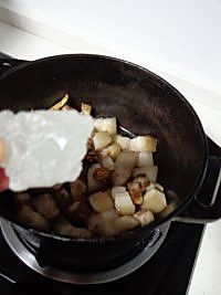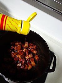 倒油,油热后放入冰糖或白糖,起沫后放入五花肉。颜色上好以后放盐和酱油少许,放入葱姜,然后加水,没过肉即可,盖上锅盖,中小火加热20-30分钟,大火收汁,捞出