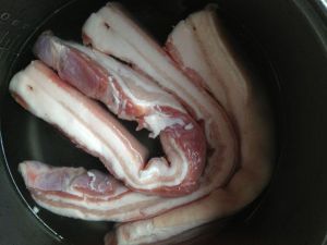 将五花肉洗净后放在冷水中,没过猪肉,然后加一大茶匙料酒腌15分钟。