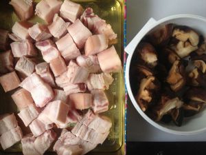 腌制完后用热水焯一下猪肉,取出放凉后切成大约1.5cm见方的块。香菇对半切开