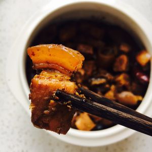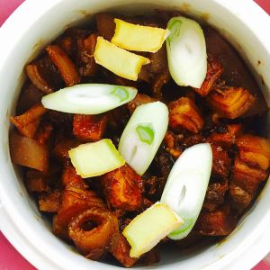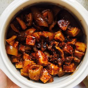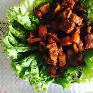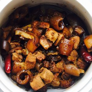 倒入凉清水,没过五花肉。转小火盖锅盖炖…大约30min后,大火收汁…盛盘