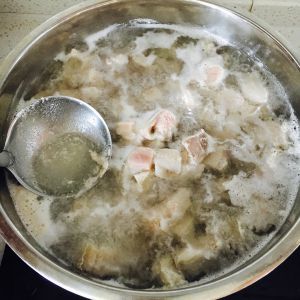 条状五花肉清洗几遍,30min泡水中途换两次水,将五花肉放入冷水锅中大火加热至沸腾。见浮出很多泡沫和脏东西。温水清洗五花肉。