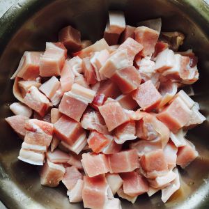 五花肉切成小块,冷水浸泡10分钟后洗净