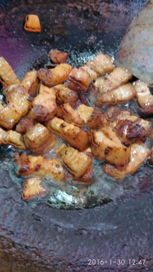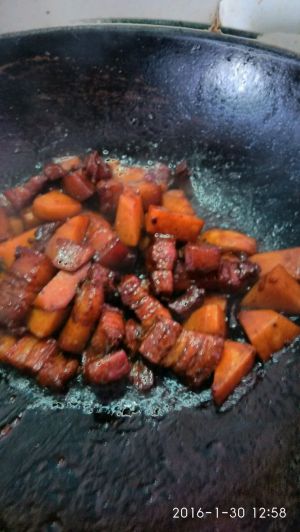 酱油翻炒均匀加入水没好过猪肉,盖上锅盖烧