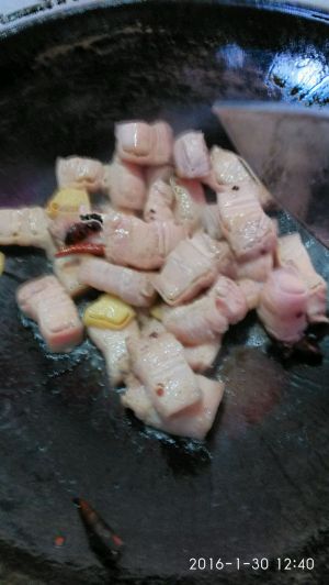 大料,干辣椒姜片炒香,放入五花肉煸炒。