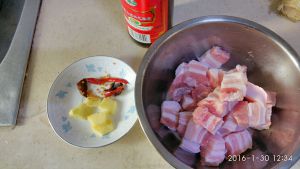 五花肉洗干净切小方块、放入锅中加冷水、大料、姜、醋一瓶盖、白酒一瓶盖、蒜。煮沸捞出、冷水冲洗血水沫、挑出调料、冲洗净装盘备用。