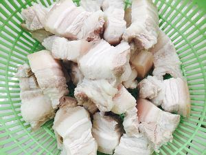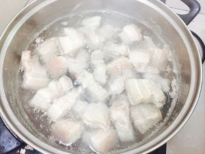 带皮五花肉,清洗干净,锅里加水,加盐,加整颗的小葱放入锅中,水煮开,加整块五花肉,煮到锅表面浮上一层油沫,捞起五花肉,切块备用。