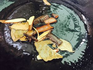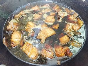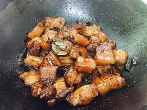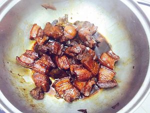 加水,没过五花肉,适当翻炒均匀后加盖,至汤汁沸腾,继续加盖烧三至五分钟后开盖,倒入高压锅内,高压锅压10~15分钟。
