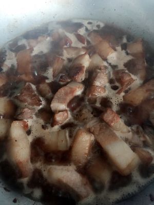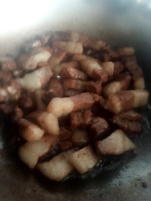 锅中有给五花肉炒糖色的油,热锅够放葱,蒜,五花肉,然后料酒和酱油,盐,十三香,胡萝卜。倒足够的水,中小火一直熬一直熬,然后放入土豆,再熬,最后放西葫芦。继续熬,知道所有实物都很软汤汁也差不多了。哦了