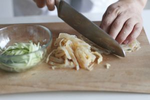 海蜇皮提前一天用清水浸泡后冲洗干净,黄瓜切丝备用。