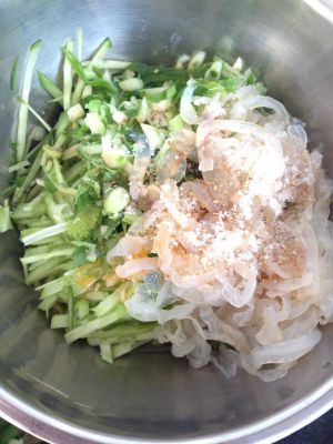 切好广黄瓜丝,放入海蜇丝,葱末,蒜末、