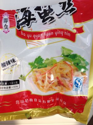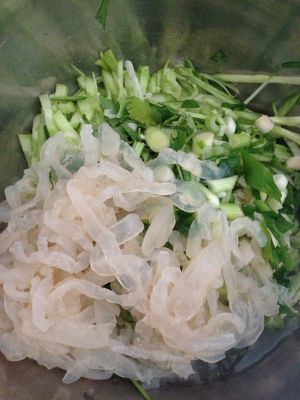 海蜇头 我喜欢这种比较肥的 口感好 切条 浸泡半天 我大约换了将近20次水吧 尽量泡到没有盐味 黄瓜条 香菜段 葱花 蒜蓉 辣椒片