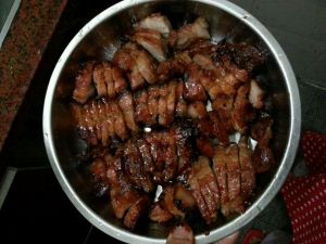 五花肉切条状,用牙签在五花肉上扎若干个小洞。取适量李锦记叉烧酱,蒜末,姜块,生抽,黑胡椒粉,少许盐和料酒拌匀,把扎过小洞的五花肉腌制12小时以上。