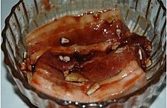 将精肉用叉烧酱、盐、白砂糖、淀粉腌制二十分钟