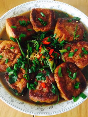 如图两面都煎好后,关小火,调料:放适量盐二勺酱油和芡粉二勺水调好,均匀淋在豆腐上,在焖几分钟就可以了。有砂锅的可以装到砂锅里焖味道更好了