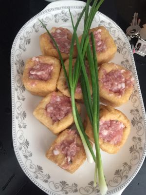 如上图酿满肉,锅放好油,烧开油,酿肉的那边向下,大火煎黄在翻另面煎