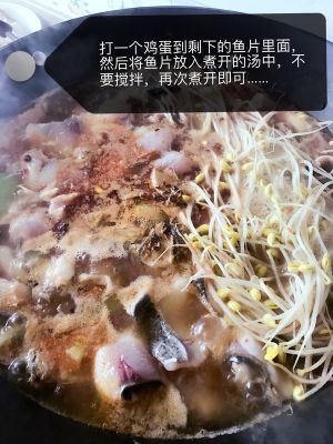 1,备好材料后热油,放姜蒜片煸炒出香味,放入豆瓣酱转小火煸炒出红油,放入一半的花椒继续煸炒出香味,之后倒入鱼骨翻炒,放入一汤匙料酒,接着倒入没过鱼骨的热水,煮开,加入豆芽煮到变软,放入适量的盐,出锅澄入大碗。2,煮一锅开水,趁着烧开水时间处理鱼片,鱼片加入适量的盐和料酒抓一会儿,感觉手粘粘的就行,打入一只蛋清,轻轻搅拌,不要抓得太狠,免得鱼片边浑,之后倒入生份,拌至鱼片都裹上生份粉,水开了分3次放入锅里打散鱼片水煮成熟,漏勺捞出铺在刚才出锅汤上,将剩余的花椒干椒葱段铺在鱼片上,浇入滚滚的热油就算出锅了!成品!