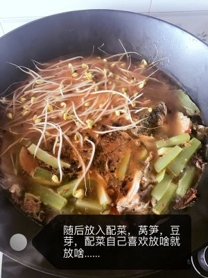 放一两油,加入葱姜蒜,加入料包,炒出香味,加水,水来后放鱼,十五分钟后加入油菜,豆芽,