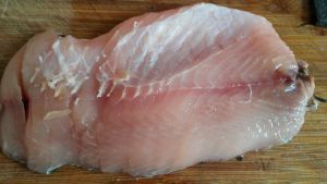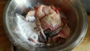 切片,连着鱼皮切两刀,切断一块。放入料酒,盐,姜粉,淀粉腌一会儿,腌的照片忘记拍了