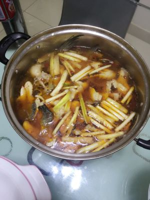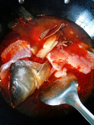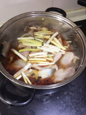 放入鱼骨鱼头,翻炒放入水,放八角,桂皮,姜