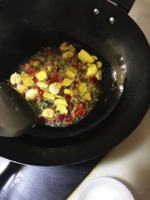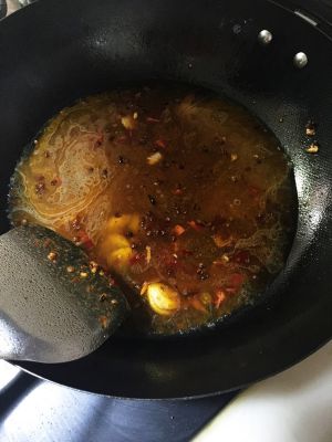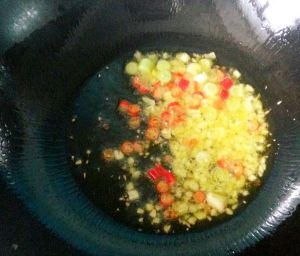 热锅凉油,放入葱蒜红辣椒碎,炒香