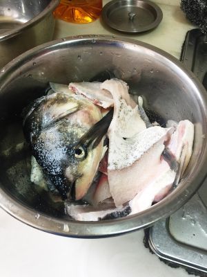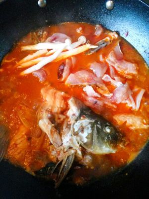 先放鱼头煮一下,然后放鱼片,在鱼片上放葱煮熟