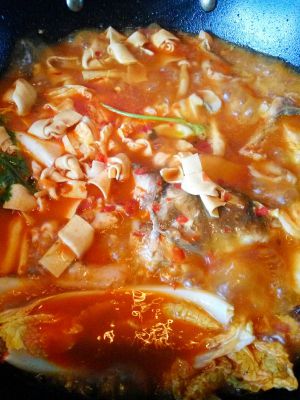 倒入鱼片,豆芽,豆腐,豆腐皮嘿嘿煮4分钟左右即可,再根据口味轻重加入盐