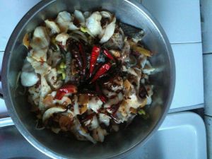 然后放入鱼片,煮开,再煮两分钟,不要煮久了,要不鱼肉会由嫩变硬。盛入刚才的容器,把刚才的那一半花椒跟干辣椒铺在面