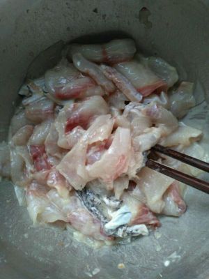 鱼肉片成3~5毫米的鱼片,鱼主刺剁成段,鱼头留下。将鱼片用蛋清,加少许盐,干淀粉和料酒,用手抓匀.