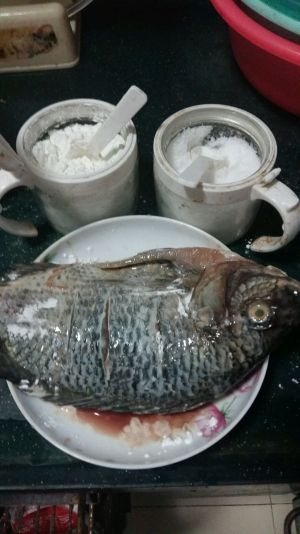 首先把收拾好的鱼抹上盐腌一会,再抹上淀粉,然后倒上油炸鱼。