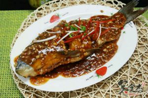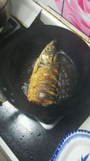 平底锅中放油七成热时将鱼放锅中煎,煎透后把鱼放置盘中,用锅中余油将蒜蓉和洋葱倒置锅中煸香出味放番茄酱,醋,白糖搅拌待白糖融化即可,然后慢慢淋在鱼身。好了,鱼就出盘了