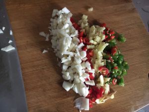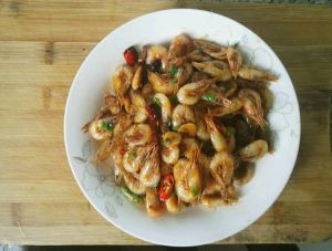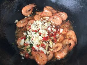 将香葱葱白切段 葱叶切粒 干辣椒鲜辣椒切斜段 蒜切片 准备完毕后放入炸虾剩下的油中大火爆香 然后将炸过的虾重新回锅翻炒 放入盐和味极鲜酱油调味