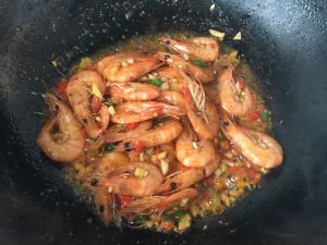 然后倒入之前过油的虾,改中火盖盖焖三分钟,后改大火翻炒15秒,倒入淀粉勾芡