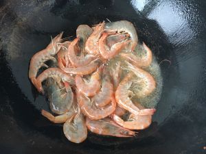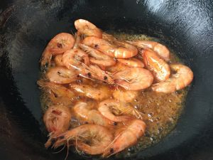 倒入对虾爆炒,待虾变色即捞起备用(这里最好是一起倒出锅,因为虾过油后那个汤特别鲜,后面焖的时候会用到)