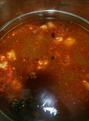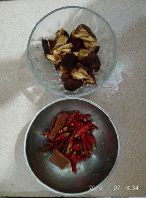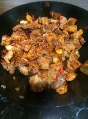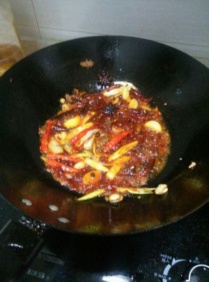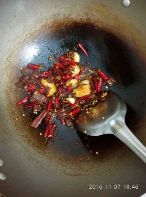 最好是用混合油 我用的是牛油和调和油 等油热了以后 就把所有的备好材料一起倒下锅 注意哦 泡椒会溅油的