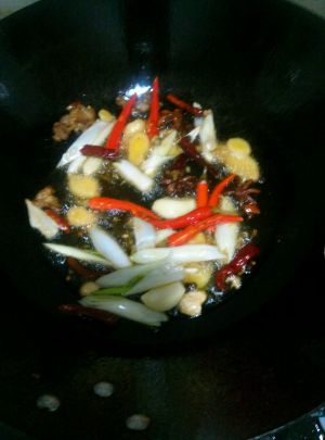 放入葱姜蒜,继续炒,前面加料的步骤,都是中小火,避免调料糊锅