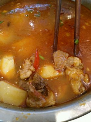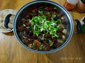 牛肉放入高压锅煮30分钟,熟透即可,完成后倒入火锅,加入适量原汤汁。美味的牛肉火锅就做好了。