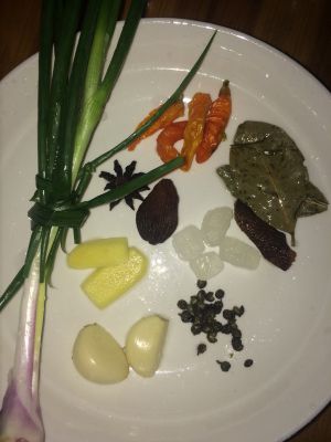 热锅凉油,放入豆瓣酱炒出红油,注意火不要太大以免炒糊。再放入出香葱以外的所有料,炒出香味,放入牛肉混合均匀。加入开水,切记不可放冷水。