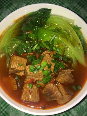 加上红烧牛肉 牛肉汤汁 多点儿 加上黄瓜丝 香菜段 就可以开动啦