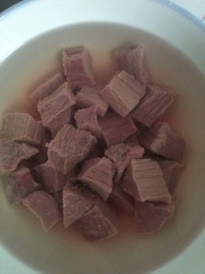 牛肉洗净切块放水里侵泡10分钟,泡去血水。凉水下火水开煮5分钟,捞起。