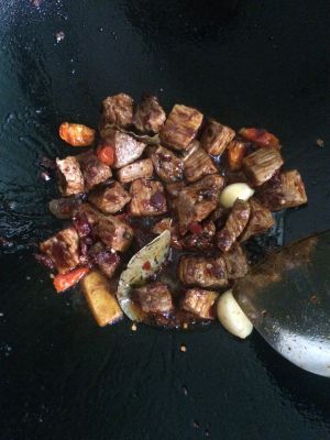 炒出沫以后会出现焦糖色,倒入牛肉。