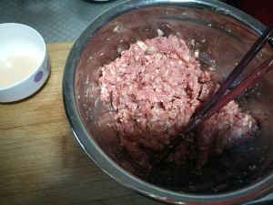 肉馅里放盐,淀粉,胡椒粉,姜葱末,鸡蛋顺方向充分搅匀,并摔打有弹性。