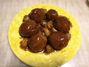 然后放入糖、醋、酱油(调色用),倒入丸子,煮3-4分钟,使之充分吸收汤料。然后丸子出锅摆盘,剩下的汤汁勾芡出锅,淋在丸子上。