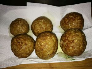 肉做成大小相同球状,锅内多放些油煎炸至金黄色