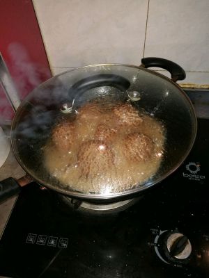 锅中放水,把炸好的肉丸放入,水埋到肉丸三分之二处,加调料酱油,料酒、八角一个、大葱,冰糖用中火焖煮十分钟左右至熟透,最后放味精用淀粉勾芡收汁。(味精在高温下会成生一种物质对身体有一定危害,所以我养成习惯出锅前放味精)